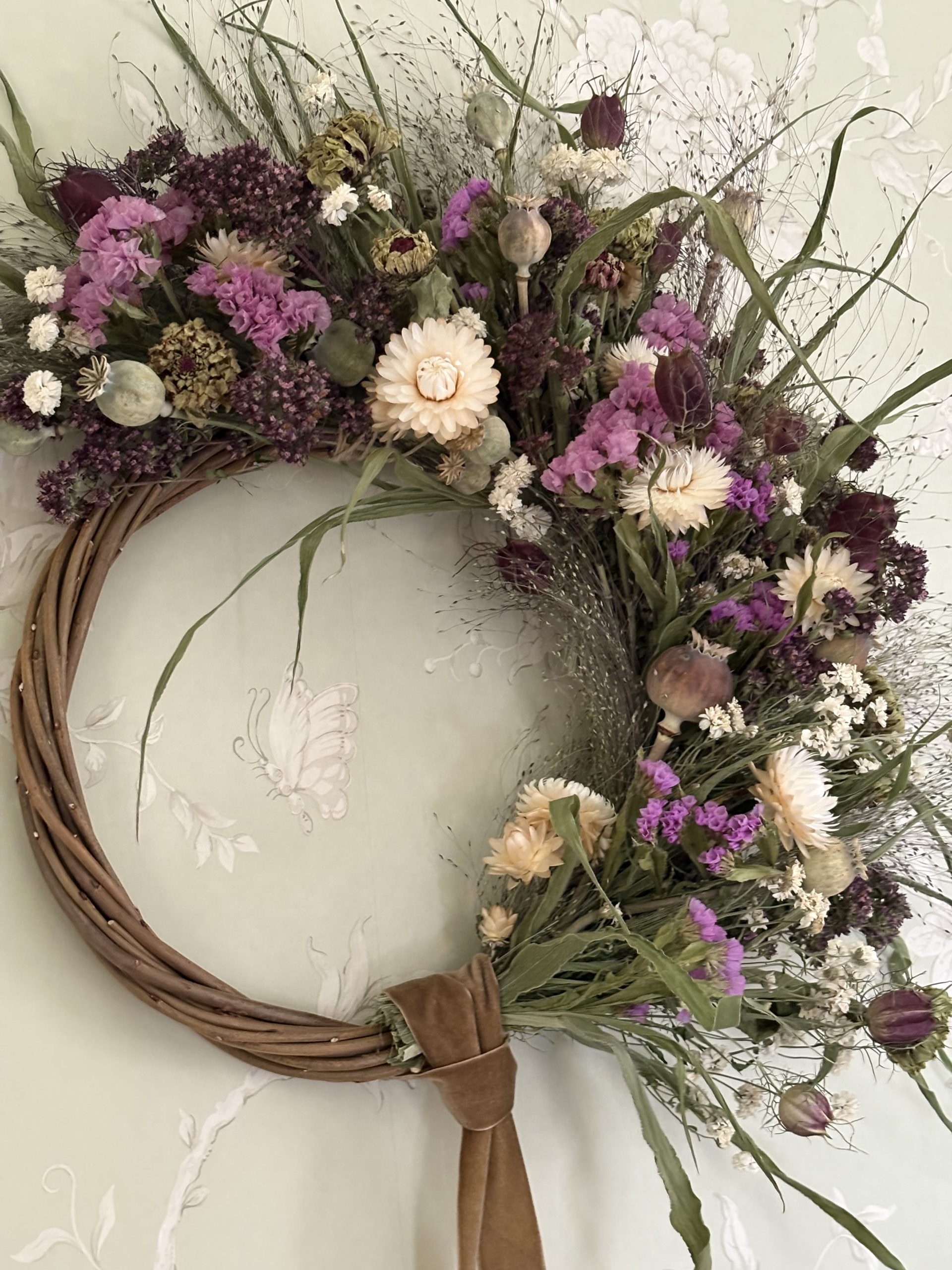 An everlasting dried flower half-moon wreath, made with exquisite material harvested and dried from our cut flower farm. These wreathes make beautiful, long-lasting displays for the home. The smaller ones make lovely table centre pieces too.